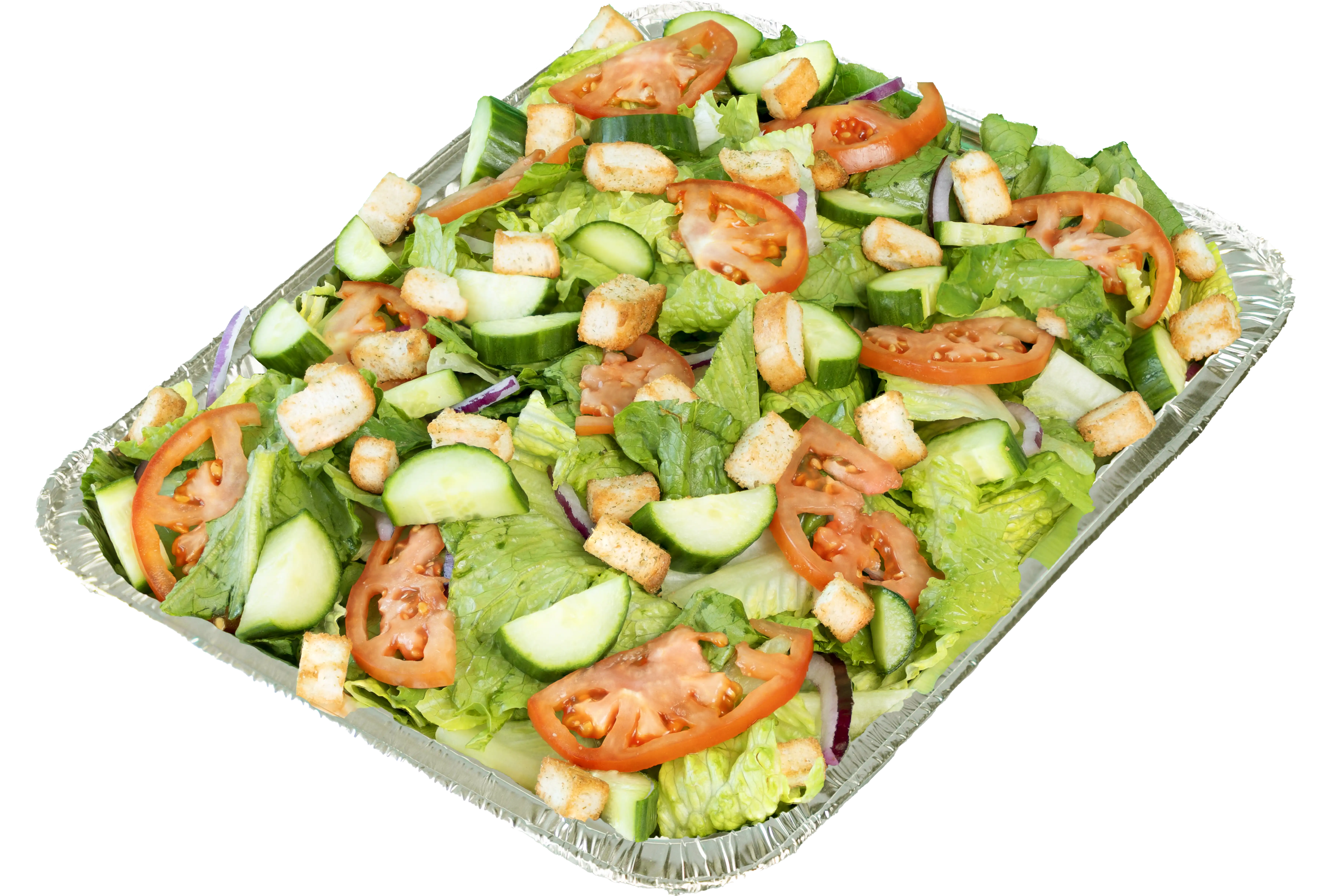 Fresh Romaine Lettuce tossed with Red Onions, Tomatoes, Cucumbers and topped with Croutons. Your choice of Dressing.